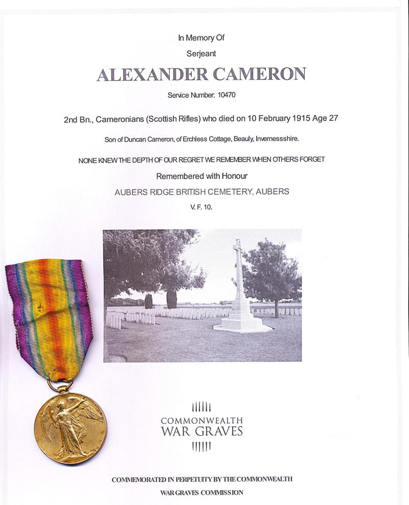 The life and supreme self sacrifice of Alexander Cameron (son of Duncan Cameron, Erchless Cottage, Beauly, Inverness-shire, Scotland) is commemorated in perpetuity by the Commonwealth War Graves Commission at the Aubers Ridge British Cemetery located at Aubers, France, where his bodily remains lie buried under a headstone engraved with his regimental badge and service details, and the inscribed epitaph: