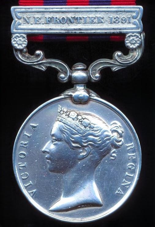 India General Service Medal 1854. Silver issue with clasp 'N.E. Frontier 1891 (1804 Rifleman Guman Singh Thapa 1st Bn 2nd Gurkha Regt)