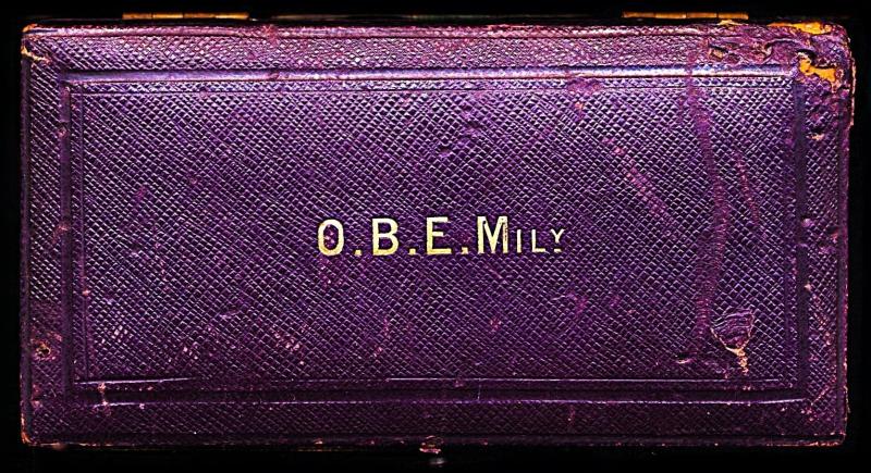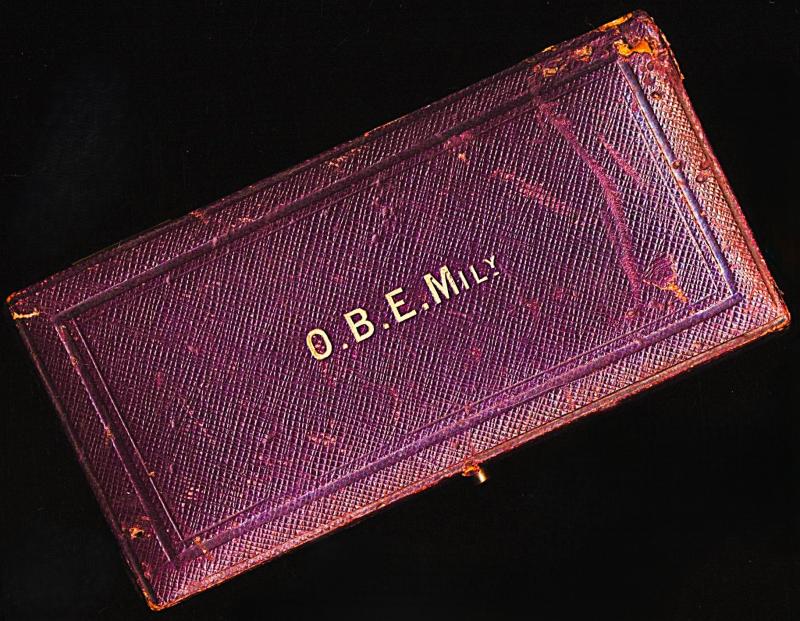 The outer lid of the case with gilt tooled letters O.B.E. (Mily)