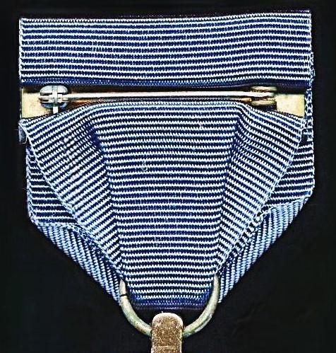 The medal riband fitted with its metal mounting bar, this latter complete with its hinged pin & intricate drop-lock clasp fittings as issued