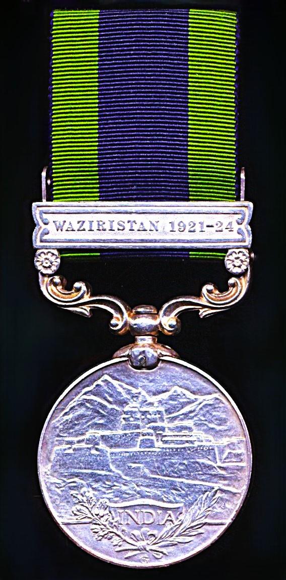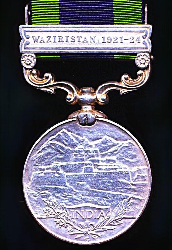 India General Service 1908-35. GV first type. Silver issue, with clasp 'Waziristan 1921-24 (2-Lt. E. G. Bushell. 5-6 Raj. Rif.)