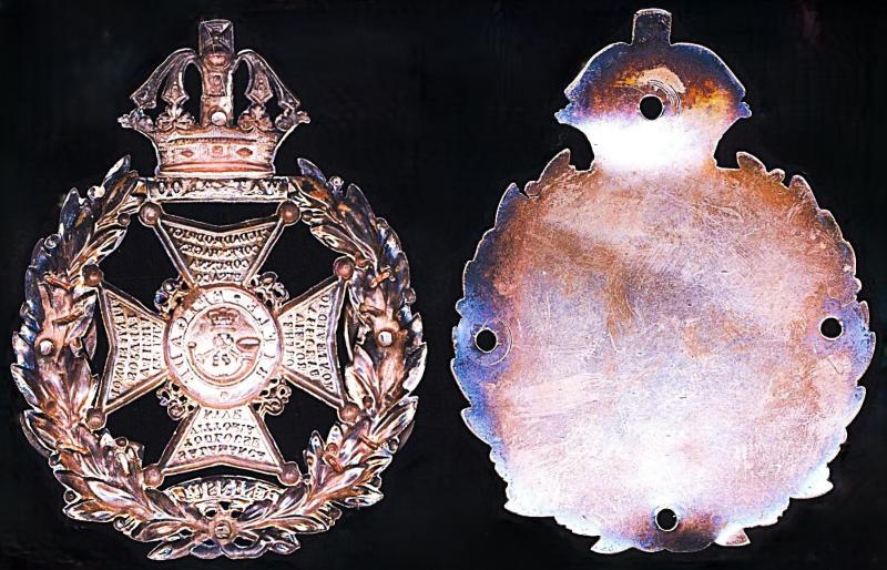 A fine die-stamped example. Within a laurel wreath surmounted by a Guelphic crown resting on a tablet inscribed “Waterloo”, a Maltese cross with lions between the arms and ball finials to the tips. To the centre, within a circlet inscribed 'Rifle Brigade', a Victorian crowned strung bugle. The arms of the cross bear numerous honours of the Regiment, the wreath bears a further five scrolls with four x battle honours - upto and including those awarded for the Crimean War. Between the bottom arm of the cross and the wreath, a scroll inscribed Peninsula'. Four screw posts to reverse and complete with original backing plate.