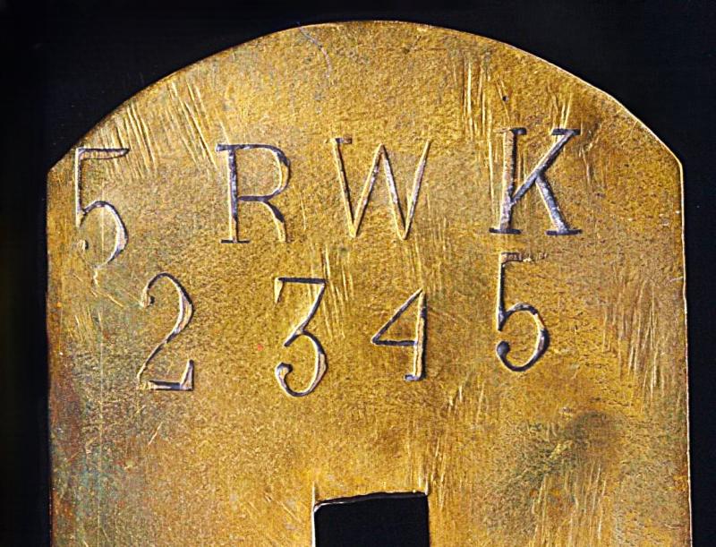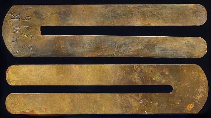 - Brass Button Stick. Marked indented with regimental details ' 5 R.W.K. 2345'