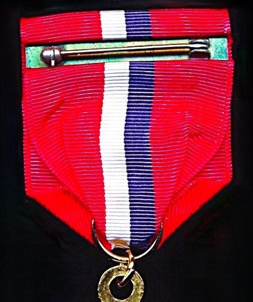 The corded silk riband with 9mm crimp-brooch with United States Federal Government contractor hallmark 'LIGI'. The crimp brooch retaining the original intricate long-hinged pin and intricate drop-lock clasp fittings, as issued