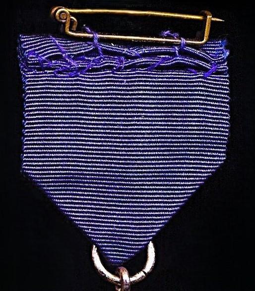 The reverse of the silk issue riband with a hinged pin and clasp mounting bar, as issued / worn