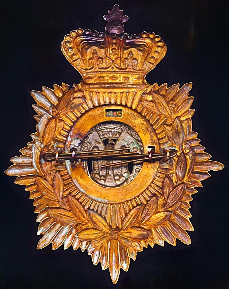 The insignia comprises the standard gilding metal base plate in use by the British Army in the late Victorian era, on which in the centre is inserted to standard pattern white metal regimental cap badge. as worn on Home Service 'Blue Cloth Helmet' 1887-1902