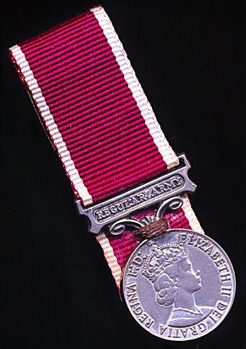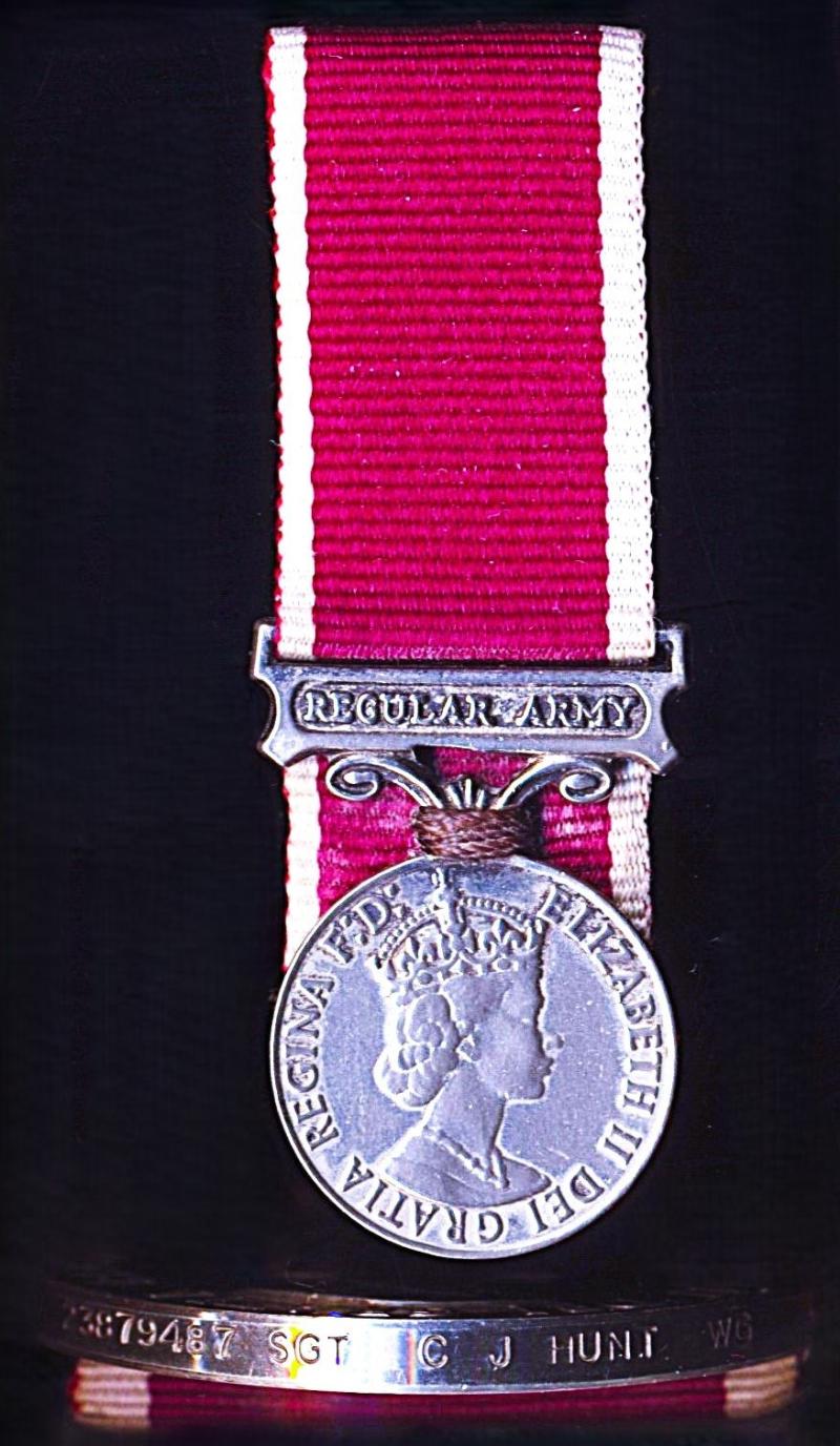 A positively attributed miniature Military Long Service and Good Conduct Medal. EIIR second issue with clasp 'Regular Army' (23879487 Sjt C J Hunt WG