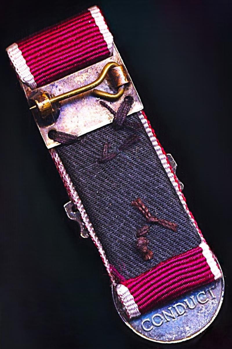 The medal mounted in the court-style and as-worn by the recipient. The reverse of the medal mounting pad fitted with a white-metal mounting bar that retains its hinged pin and clasp fittings
