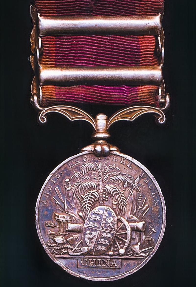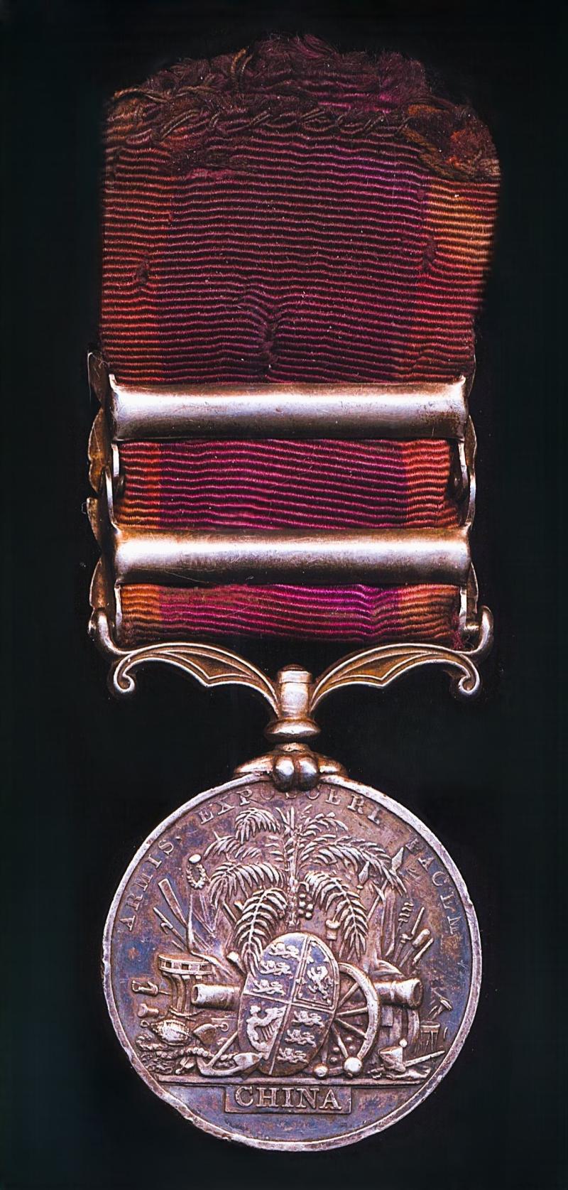 Awarded for the Second Opium War, the medal is now dark toned with patina and fitted with a soiled silk riband, the medal clearly having been left undisturbed in a smokers environment for many years