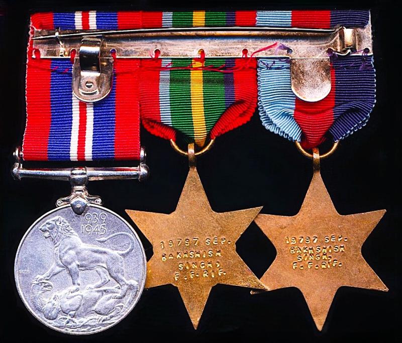The recipients regimental number indicates a soldier recruited into the Indian Army sometime after December 1939, and a subsequent casualty of the Malaya Campaign 1941-42, where he would have become a Far East Prisoner of War. While many thousands of captured Indian Army personnel subsequently joined the puppet Indian National Army, Sepoy Bakhshish Singh was not one of them, and remained 'loyal to his salt' (WW2 British campaign medals were not issued post-war to Indians who had served in the puppet INA)