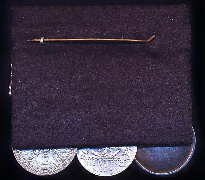 The medals mounted in the court-style. The reverse of the mounting pad fitted with a white-metal mounting bar that retains its long hinged pin & clasp fittings