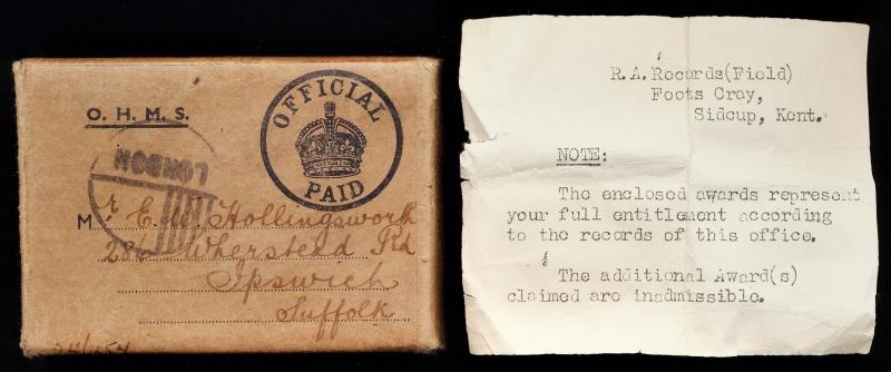 The Royal Artillery Attestation records held by The National Archives show that Eric William Hollingworth attested for the Royal Regiment of Artillery in 1939, at which time he was allocated the unique Army Number 980429, and was initially posted to the war raised 9th Field Training Field Regiment Royal Artillery (9 Fd Trg Regt, was located at Harrogate, Yorkshire, between 1939 and its disbandment in 1943). Eric took his discharge from the British Army on 8 April 1946
