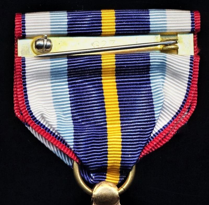 The medal riband drape fitted with the original mounting brooch with intricate hinged pin & drop lock clasp as issued