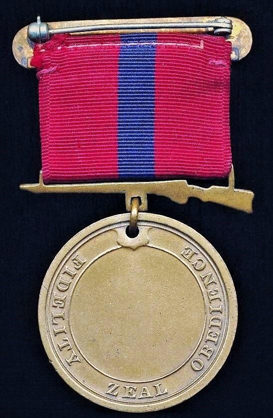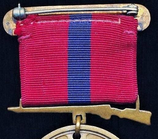 Medal suspended from the integral top brooch bar on riband. The reverse of the brooch retaining the original hinged pin and intricate drop clasp fittings as issued