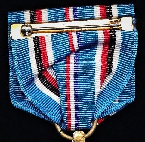 The corded silk riband with 9mm crimp-brooch with United States Federal Government contractor hallmark 'Lordship NY-GI'. The crimp brooch retaining the original intricate long-hinged pin and intricate drop-lock clasp fittings, as issued