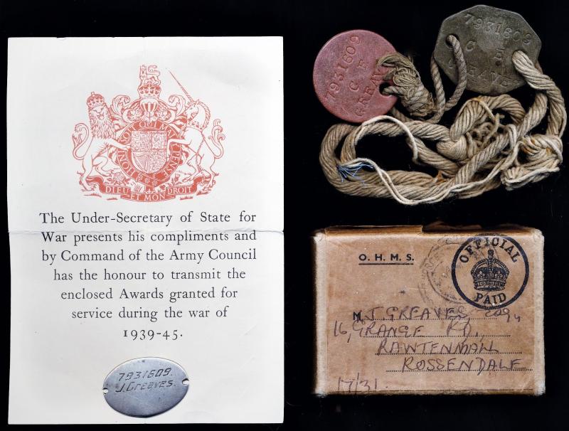 - Silver (English hallmarks on reverse) private purchase Identity Disc with recipients unique Army Number and name ’7931609' J. Greaves’