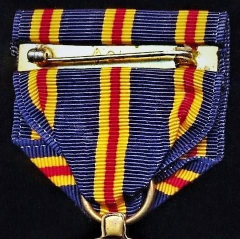 The silk corded medal riband is fitted with a 12mm crimp-brooch (circa 1960'-1980's), the mounting bar having Federal Contractors hallmark that shows 'Diamond symbol with GI letters' (for medal maker Williams & Anderson Co, Providence, RI). The brooch complete with a long-hinged pin & intricate drop-lock clasp fittings, as issued