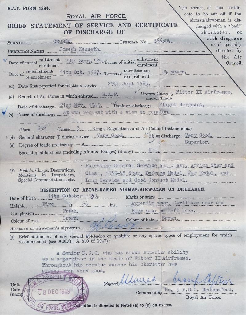 - Original RAF Form 1394. Brief Statement of Service & Certificate of Discharge (dated December 1949)