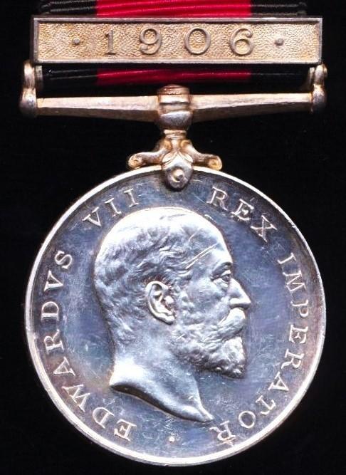 In 1907 the Natal Government was authorised to issue a silver medal in respect of the Natal Rebellion of 1906, for services between, 8 February - 3 August, 1906. Those who served for 50 days on active service were awarded the clasp to the medal. It is estimated that 10,000 medals were issued, of which about 20% were issued without clasp