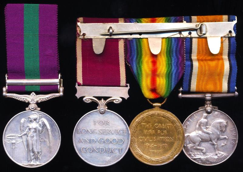 The Great War and LSGC medals mounted as-worn by the recipient, in the swing-style. The reverse of the white metal mounting bar retaining its long hinged pin & clasp fittings. The GSM is loose and retains its original long length of silk medal riband as-issued