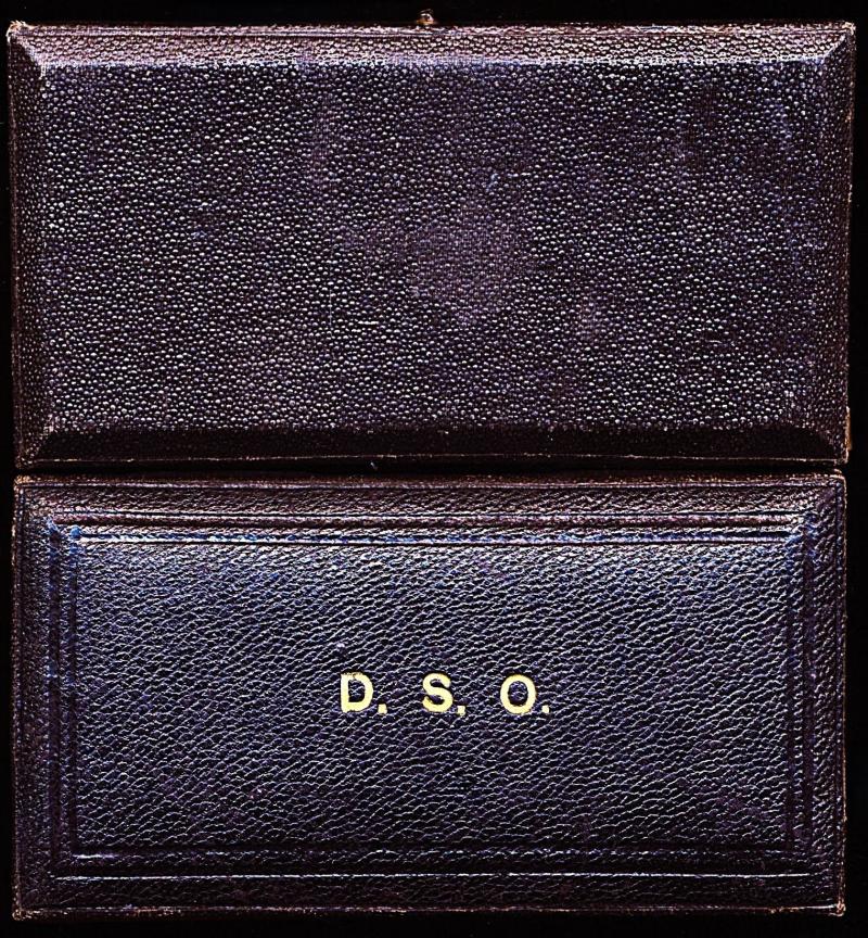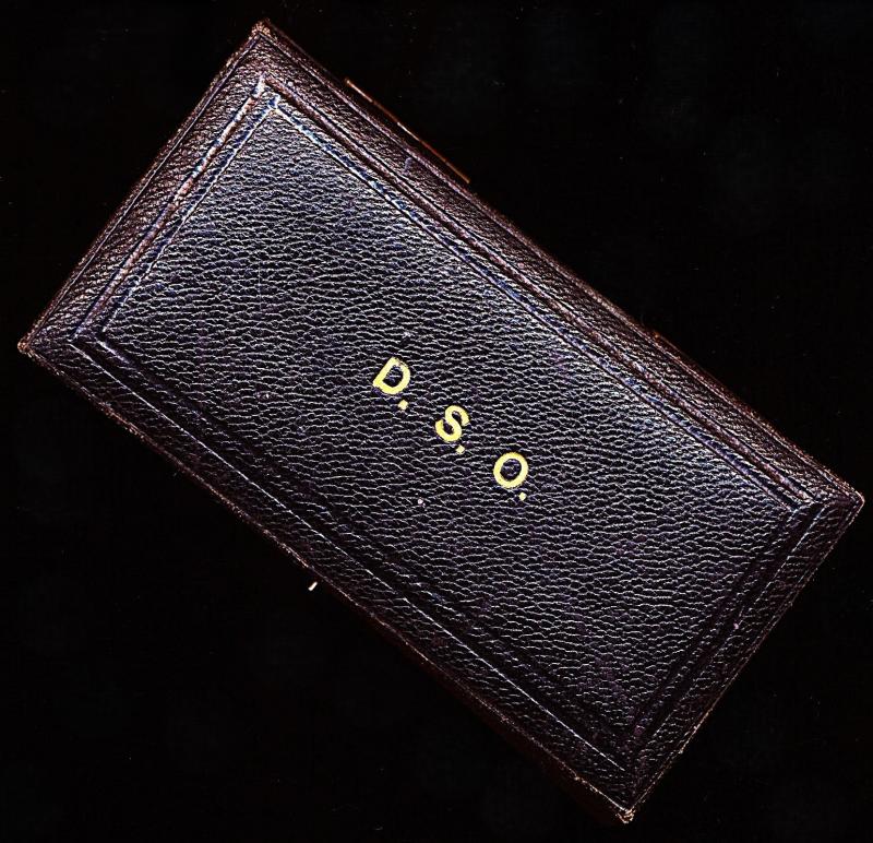 The leatherette plush lined hinged case with silver tooled letters 'D.S.O.' on outer lid