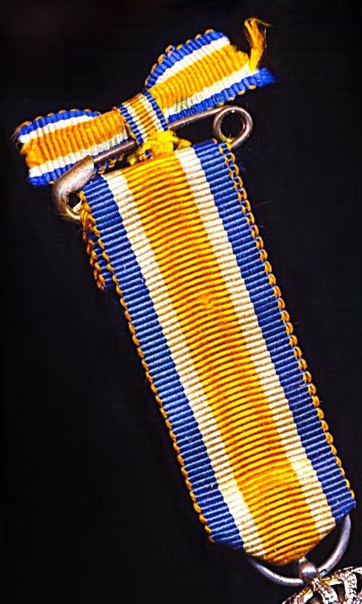 The order fitted with a long clean length of silk riband, this fitted with a reduced size safety pin hanger attached to a silk bow riband