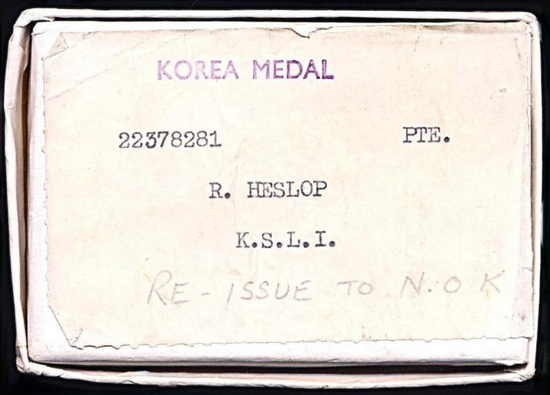 - Korea Medal (22378281 Pte. R. Heslop, K.S.L.I.)
