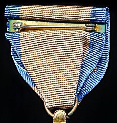 The medal riband fitted with its metal mounting bar, this latter complete with its hinged pin & intricate drop-lock clasp fittings as issued