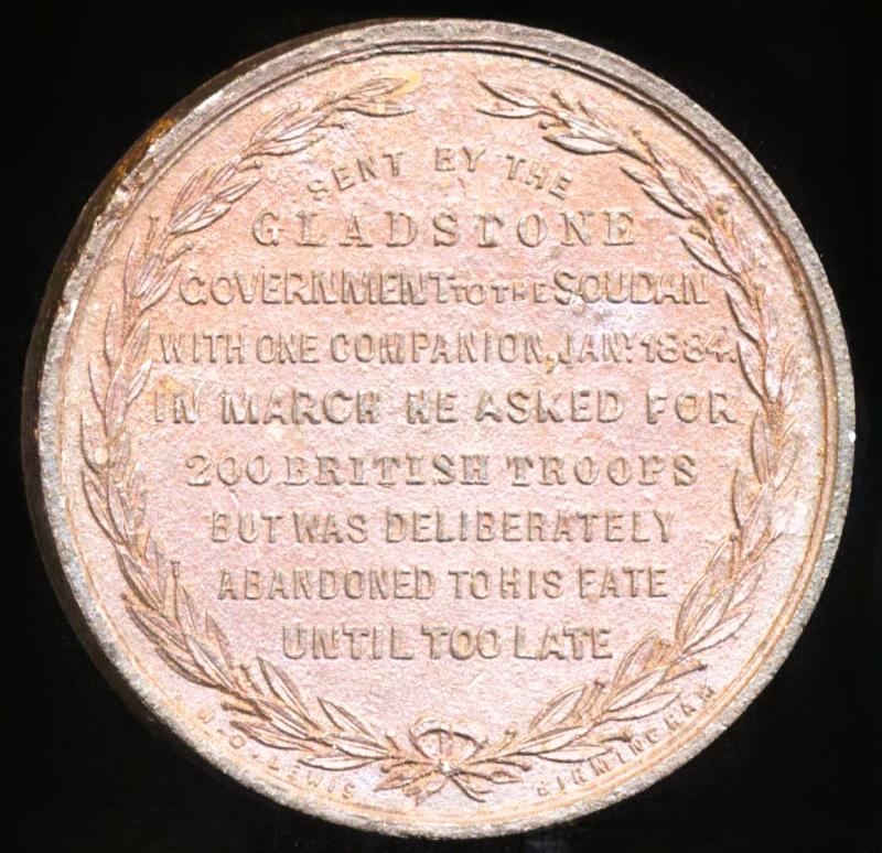 Reverse: Sent by the Gladstone government to the Soudan with one companion, Jan'y 1884 in March he asked for 200 British troops but was deliberately abandoned to his fate until too late