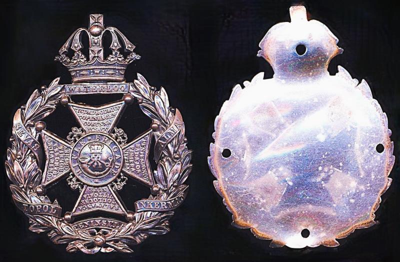 A fine die-stamped example. Within a laurel wreath surmounted by a Guelphic crown resting on a tablet inscribed “Waterloo”, a Maltese cross with lions between the arms and ball finials to the tips. To the centre, within a circlet inscribed 'Rifle Brigade', a Victorian crowned strung bugle. The arms of the cross bear numerous honours of the Regiment, the wreath bears a further five scrolls with four x battle honours - upto and including those awarded for the Crimean War. Between the bottom arm of the cross and the wreath, a scroll inscribed Peninsula'. Four screw posts to reverse and complete with original backing plate.
