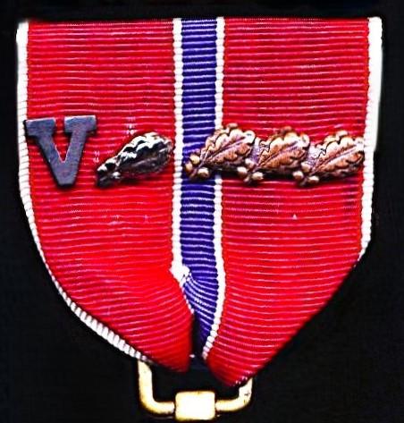 The 'Silver Oakleaf Cluster' indicates a further 5 x awards of the BSM, and the 3 x 'Bronze Oakleaf Clusters' denotes that the recipient had been awarded a further 3 x awards of the BSM = the wearer of the medal had been awarded a total of 9 x BSM awards (of which two were for Combat Valor)