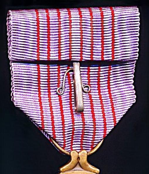 The original silk medal riband retaining the customary hook and eye riband fittings on reverse of the riband as issued