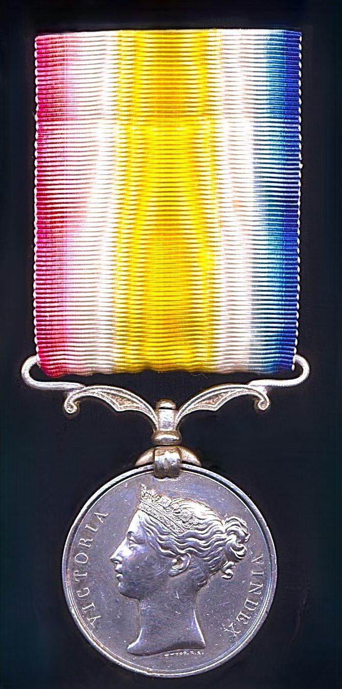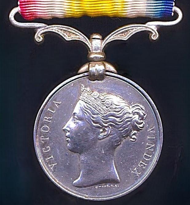 The medal fitted with an ornate contemporary replacement silver claw Indian Mutiny Medal adapted swivel suspension bar - the Indian Mutiny suspender adapted at sides for fitting the wider 'Afghan' silk ribands