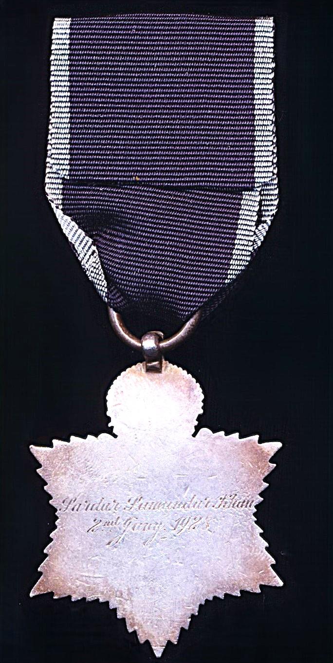 Per above referenced source, the recipient, already held the honorific local title of 'Sardar' (used in the context of Chief of a local tribe), and became Khan Sahib Sardar Khan, chief of the Borazi Tribe of Sibi, Baluchistan (now Balochistan, Pakistan).